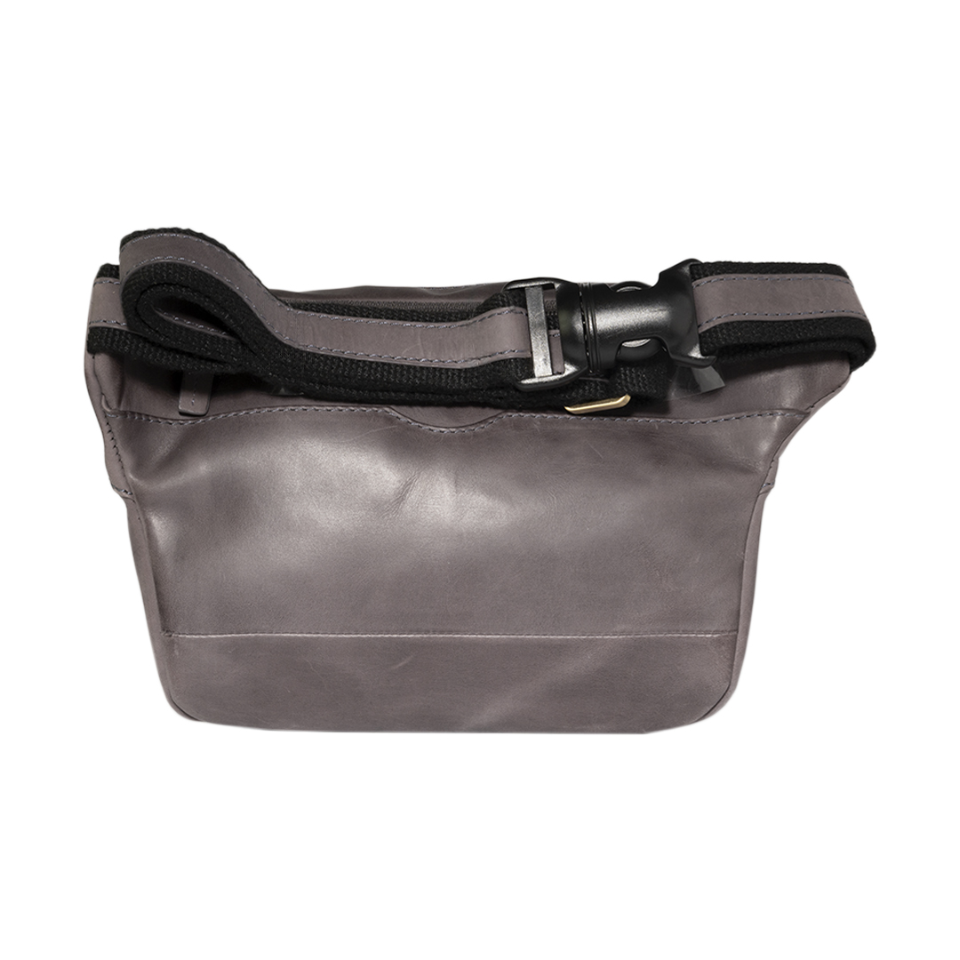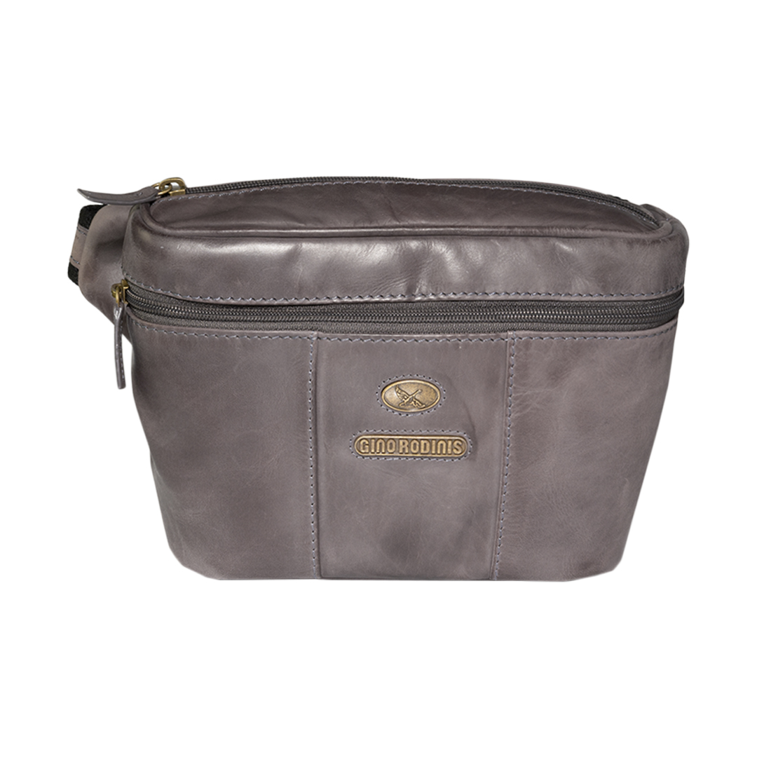 Banano de cuero gris inspirado en la moda italiana. Diseño elegante y funcional con bolsillos con cierre y correa ajustable.