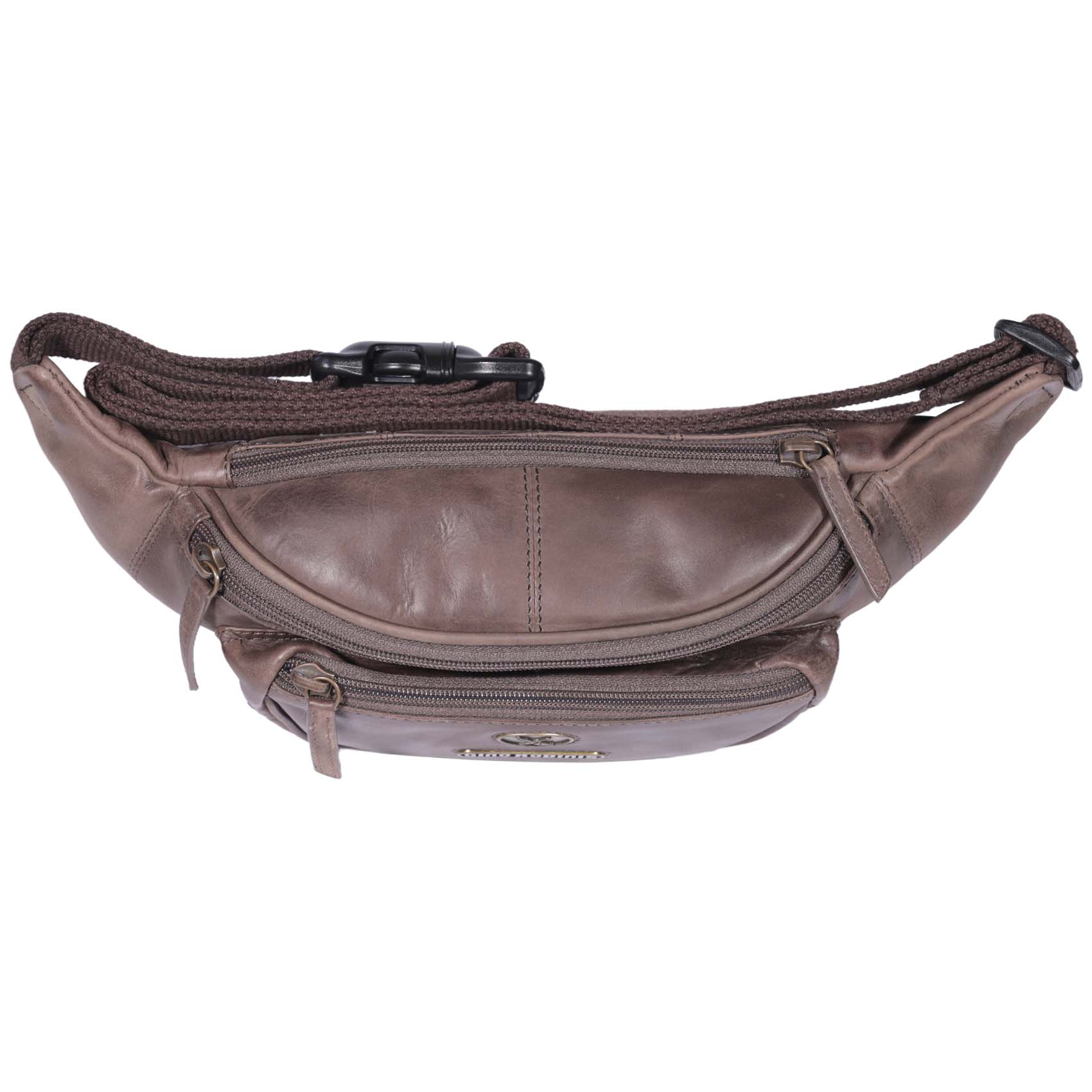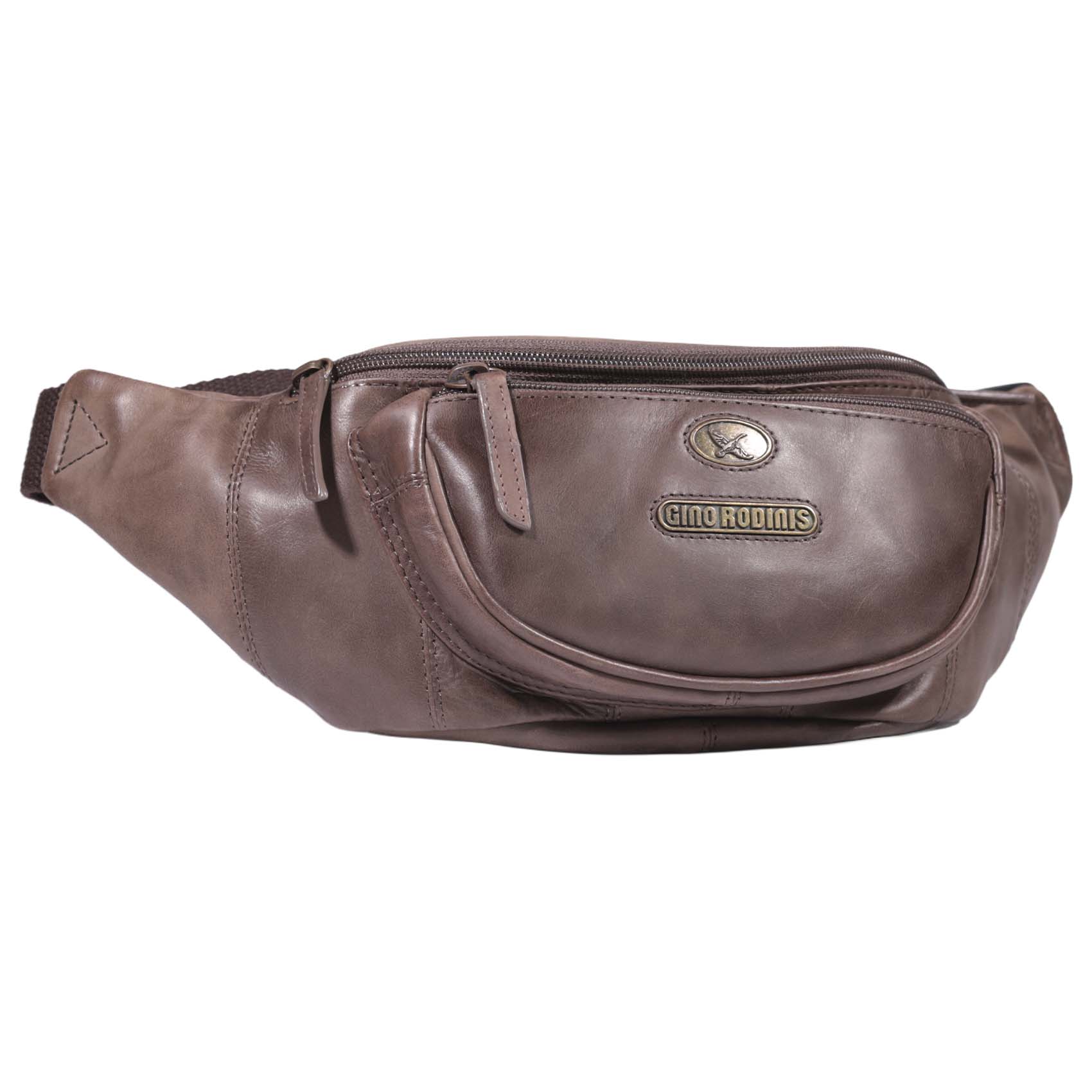 Banano de cuero café con diseño italiano. Sofisticado y funcional, con bolsillos con cierre y correa ajustable para mayor comodidad.