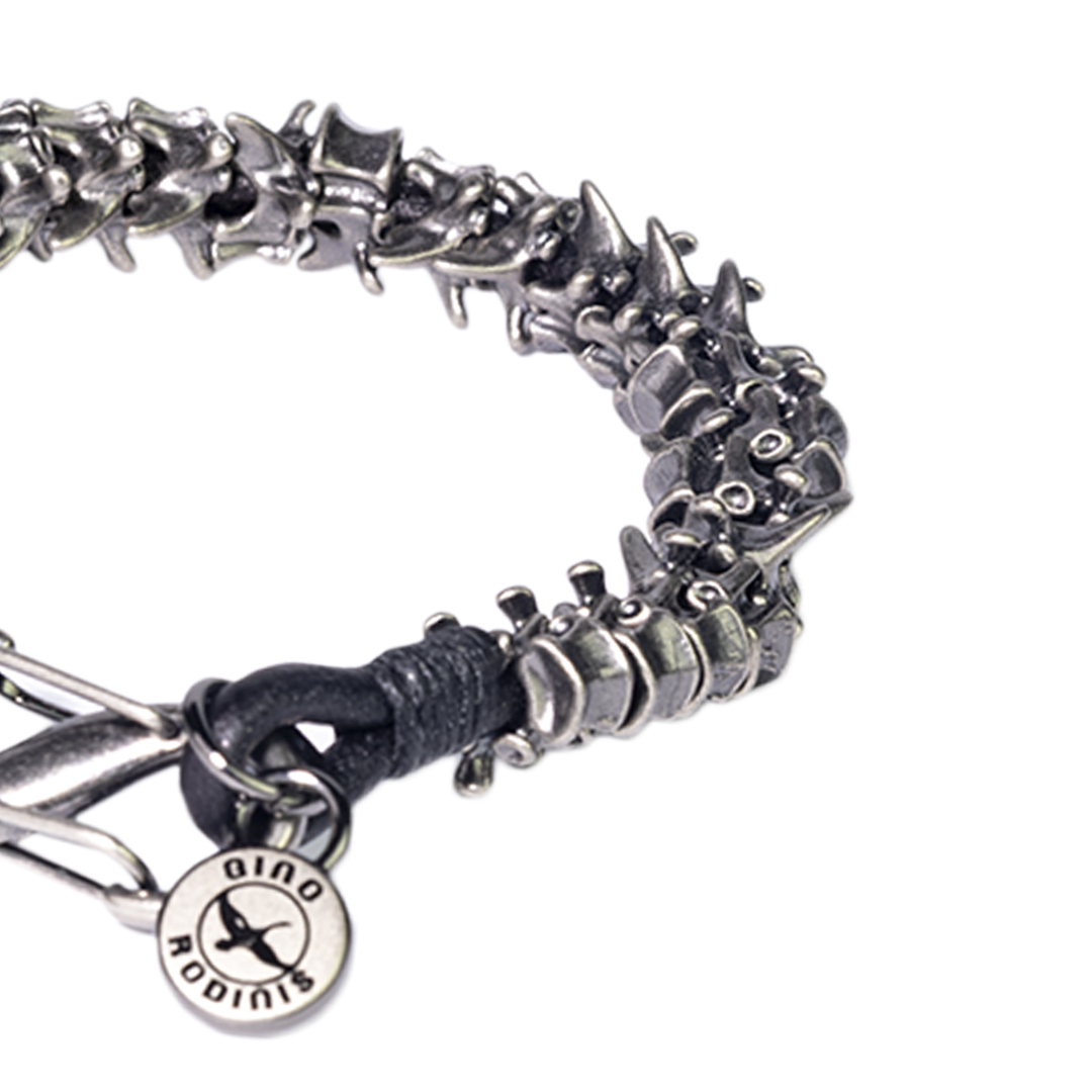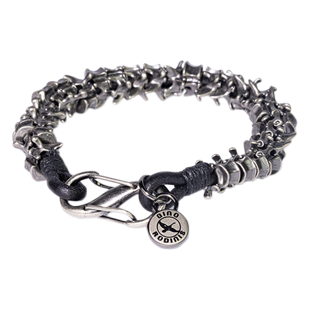 BRAZALETE DE CORDÓN DE CUERO CON PIEZAS METÁLICAS TIPO VÉRTEBRAS EN TONO PLATA ENVEJECIDA UN DISEÑO CON FUERZA Y CARÁCTER QUE RESALTA TU ESTILO EN CADA MOMENTO.