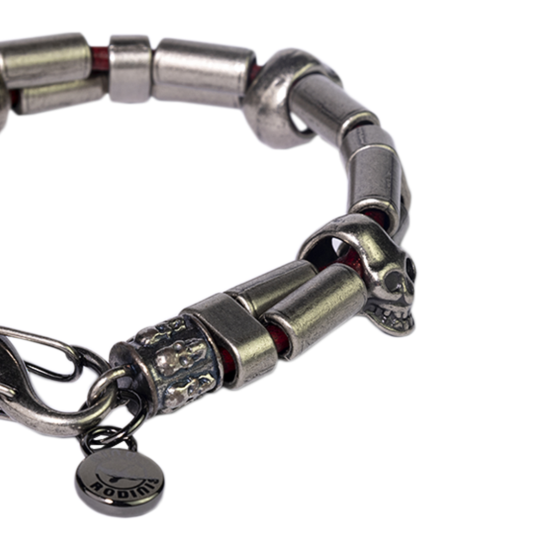 - Brazalete formado por cilindros, calaveras y otras piezas metálicas, que se entrelazan uniendo dos cordones de cuero.