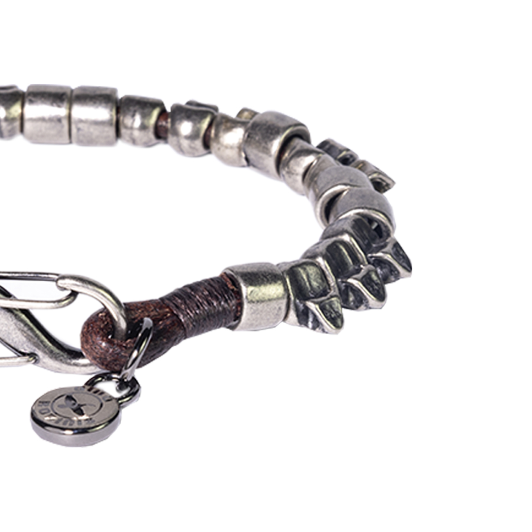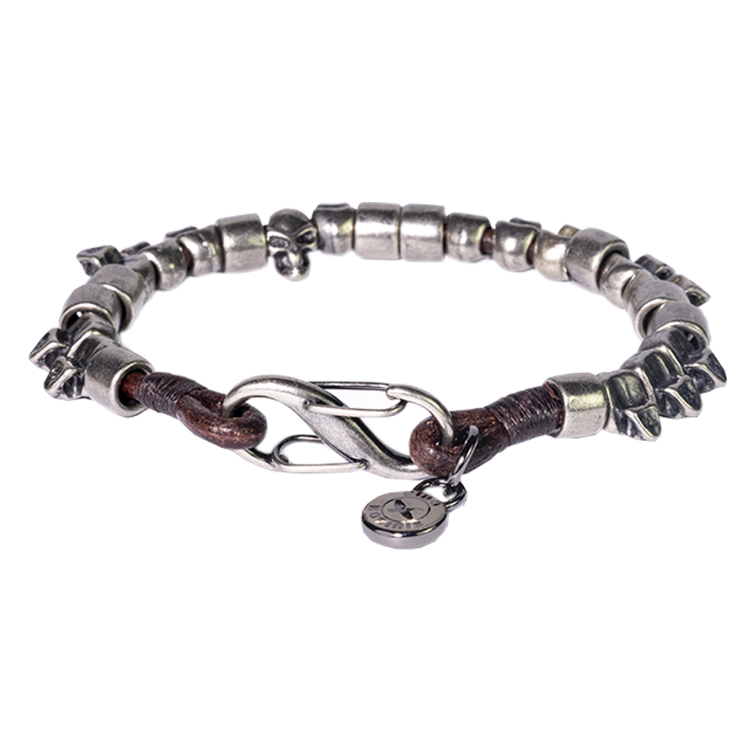 PULSERA DE CORDÓN DE CUERO CON CILINDROS Y CALAVERAS METÁLICAS EN TONO PLATA ENVEJECIDA DE DISEÑO AUDAZ QUE REFLEJA CARÁCTER Y PERSONALIDAD