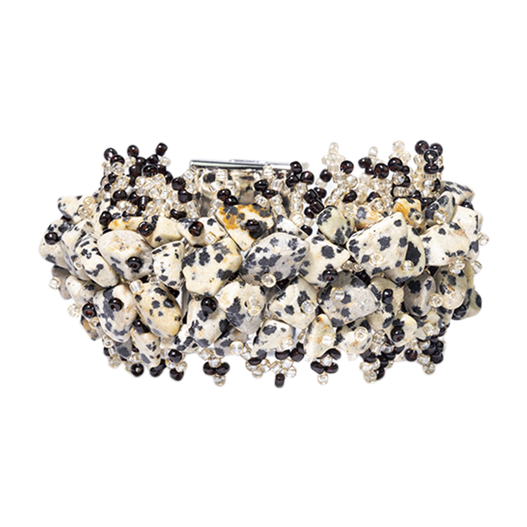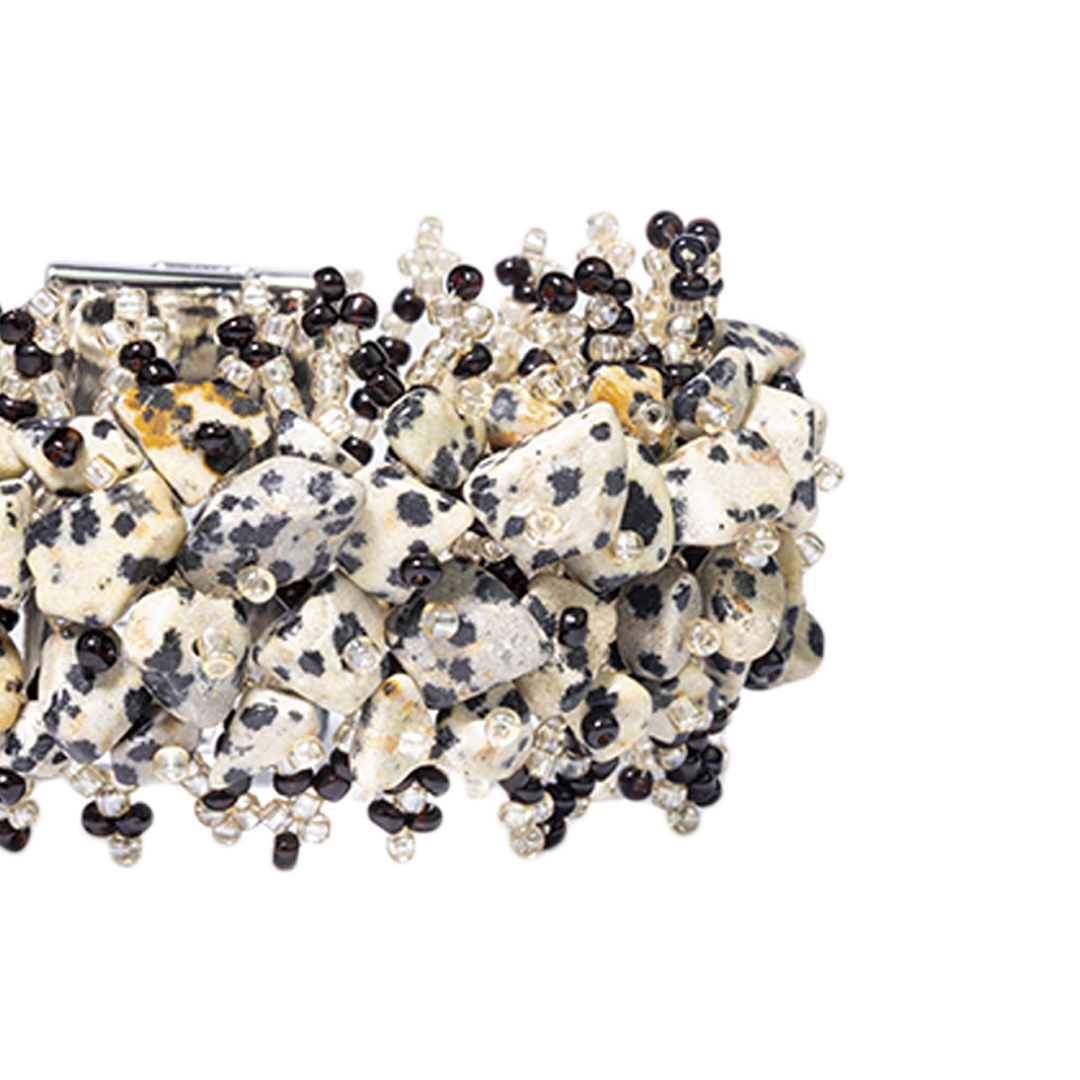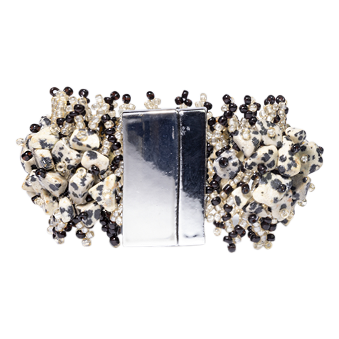 PULSERA TRENZADA DE PIEDRAS SEMIPRECIOSAS CON TEJIDO DE MOSTACILLAS AL TONO Y CIERRE IMANTADO DE DISEÑO ELEGANTE QUE APORTA DISTINCIÓN Y SOFISTICACIÓN.