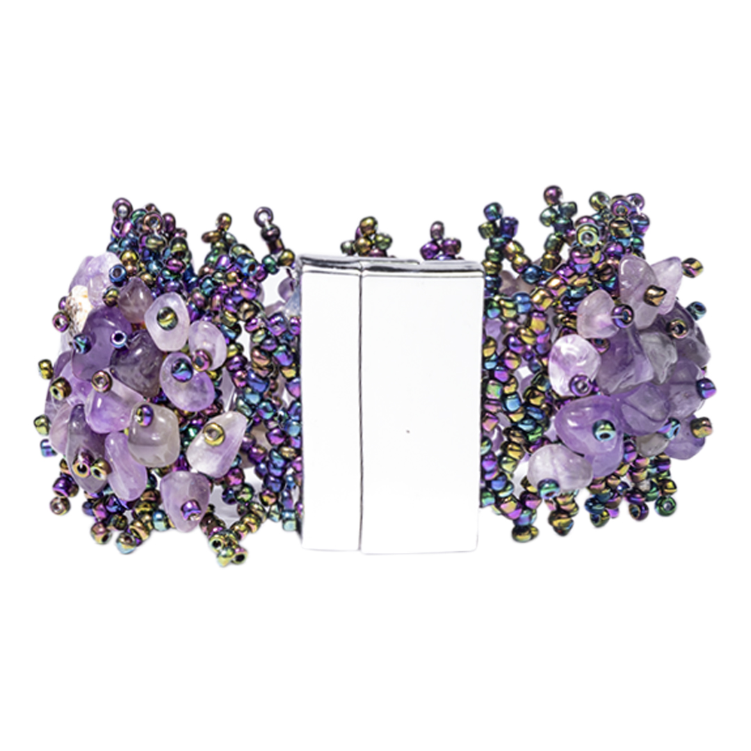 PULSERA TRENZADA DE PIEDRAS SEMIPRECIOSAS CON TEJIDO DE MOSTACILLAS AL TONO Y CIERRE IMANTADO DE DISEÑO ELEGANTE QUE APORTA DISTINCIÓN Y SOFISTICACIÓN.