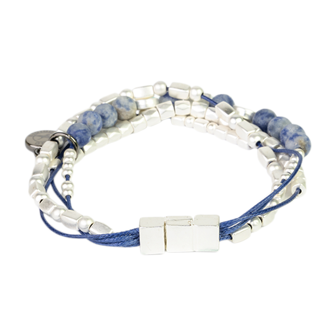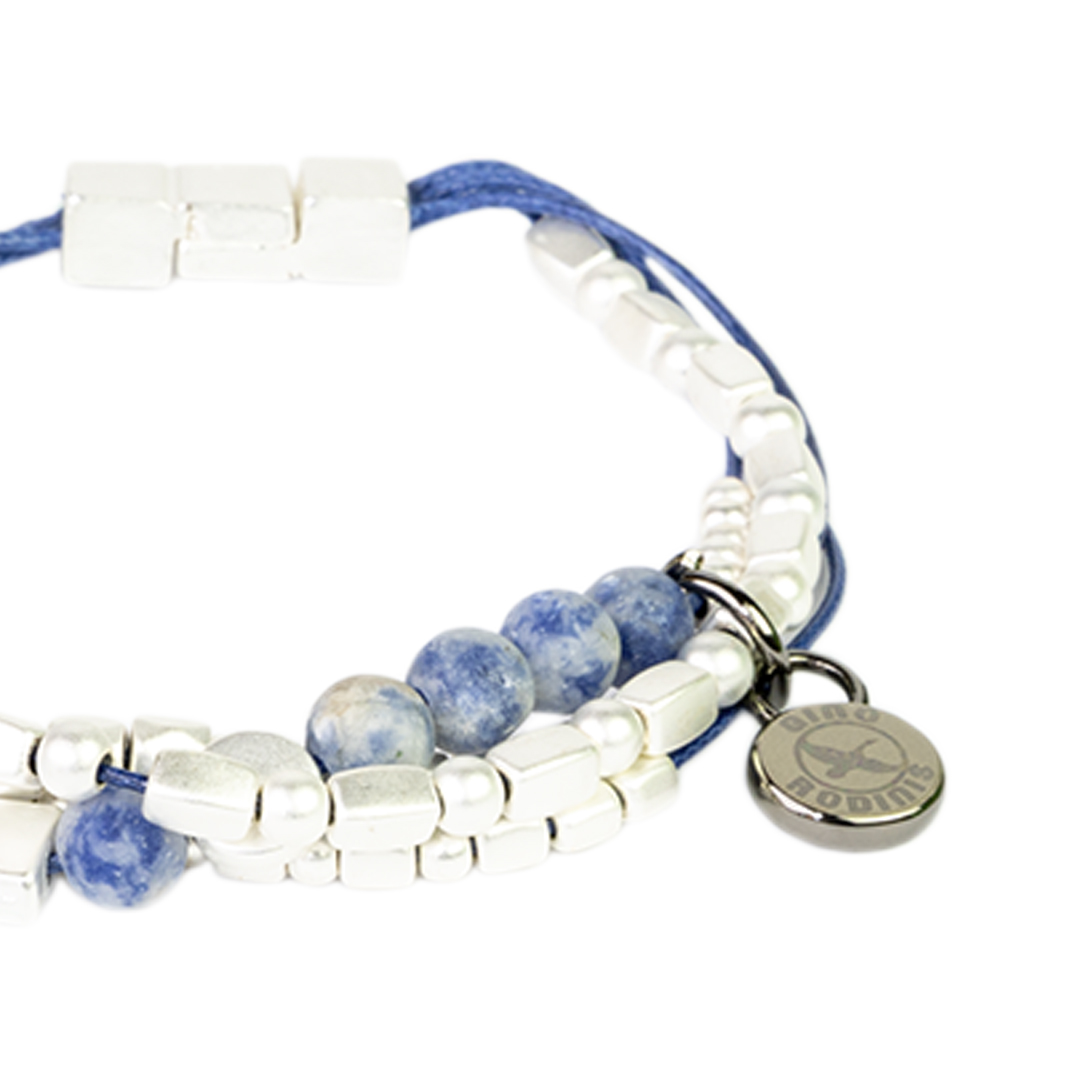 PULSERA DE CUERDAS CON PIEDRAS TIPO LAPISLÁZULI Y CUENCAS PLATEADAS CON CIERRE IMANTADO DE DISEÑO ELEGANTE QUE APORTA UN TOQUE DISTINTIVO A TU LOOK.