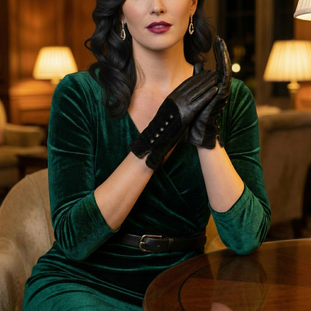 GUANTE DE CUERO MUJER, DORSO CONFECCIONADO EN GAMUZA CON 5 BOTONES FORRADOS EN CUERO AL TONO