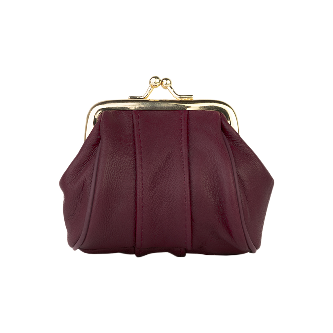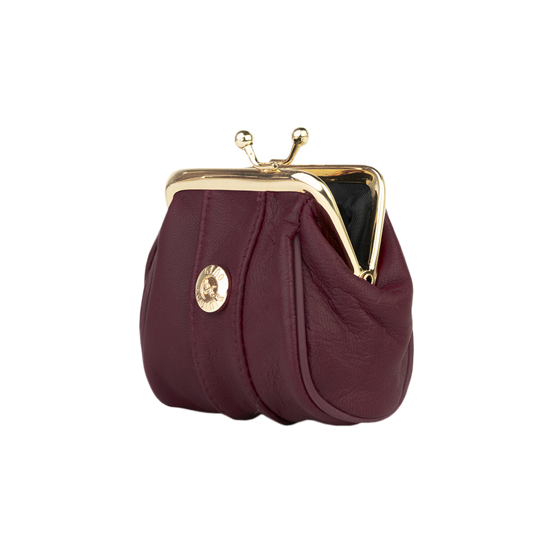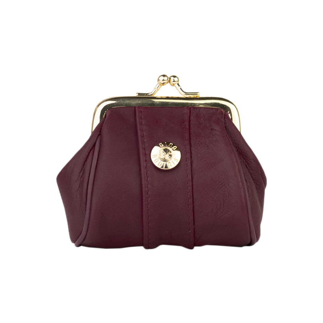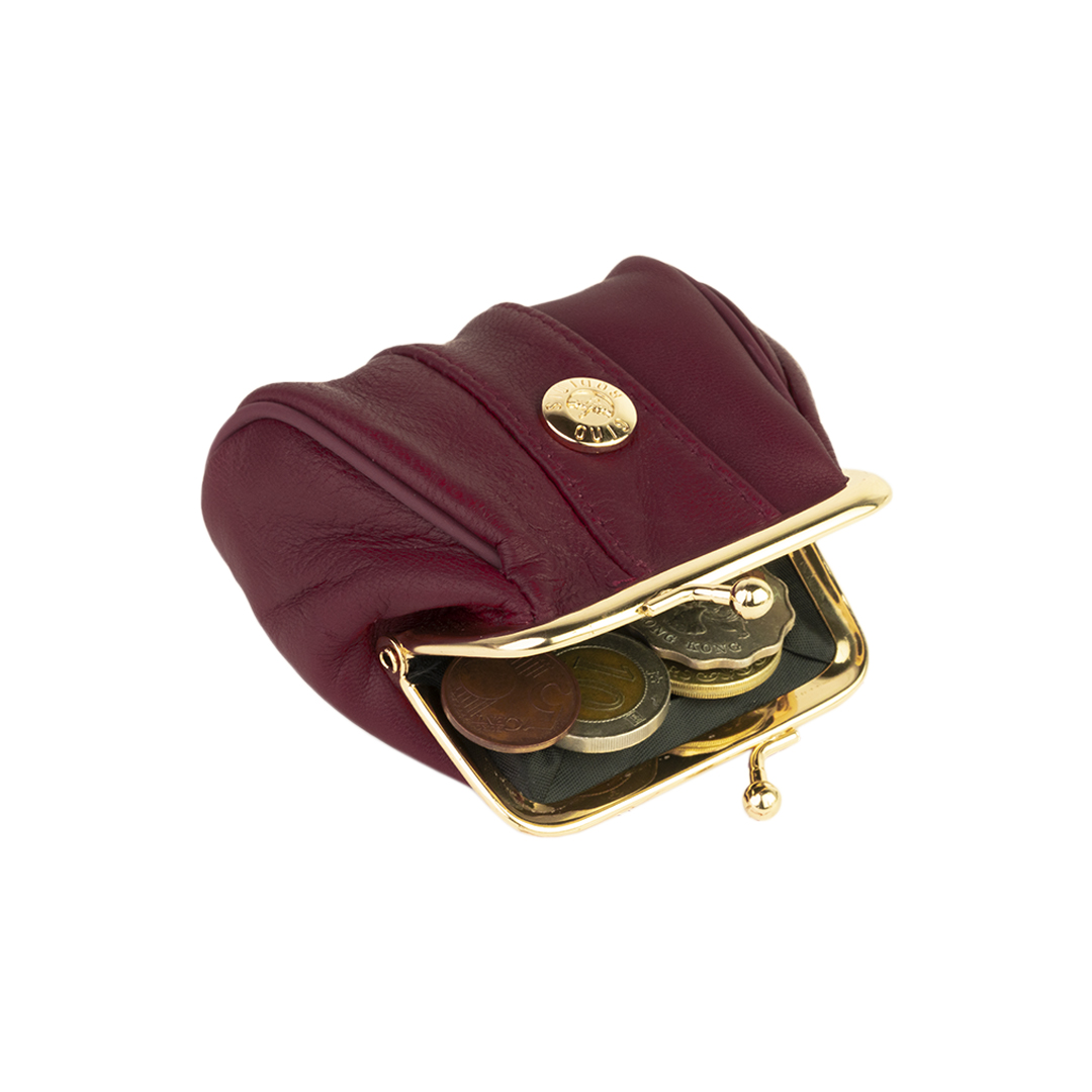 MONEDERO DE CUERO CON MARCO METÁLICO DORADO Y DOS DIVISIONES INTERIORES.