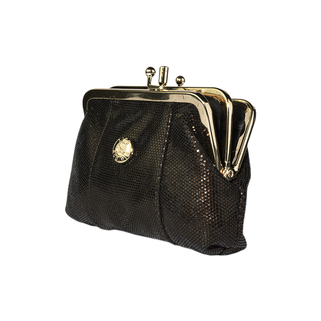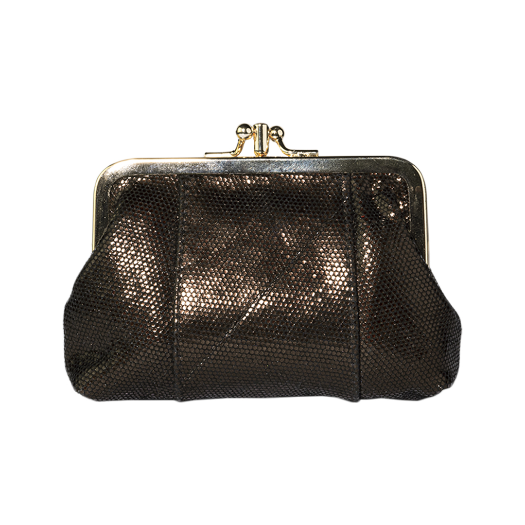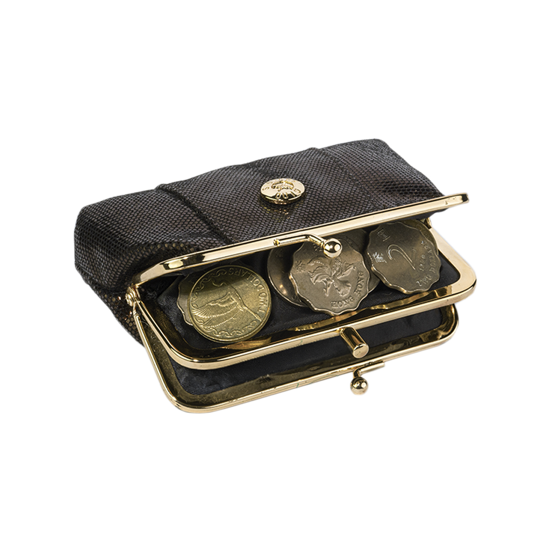 MONEDERO DE CUERO CON MARCO METÁLICO DORADO Y DOS DIVISIONES INTERIORES.