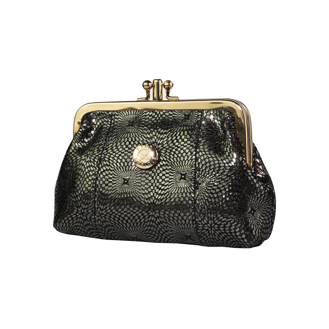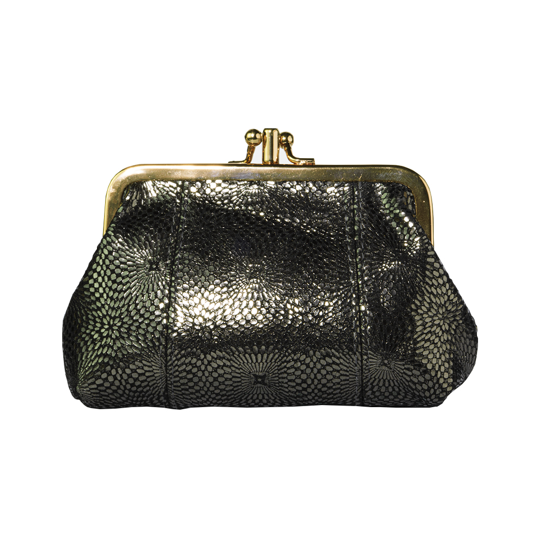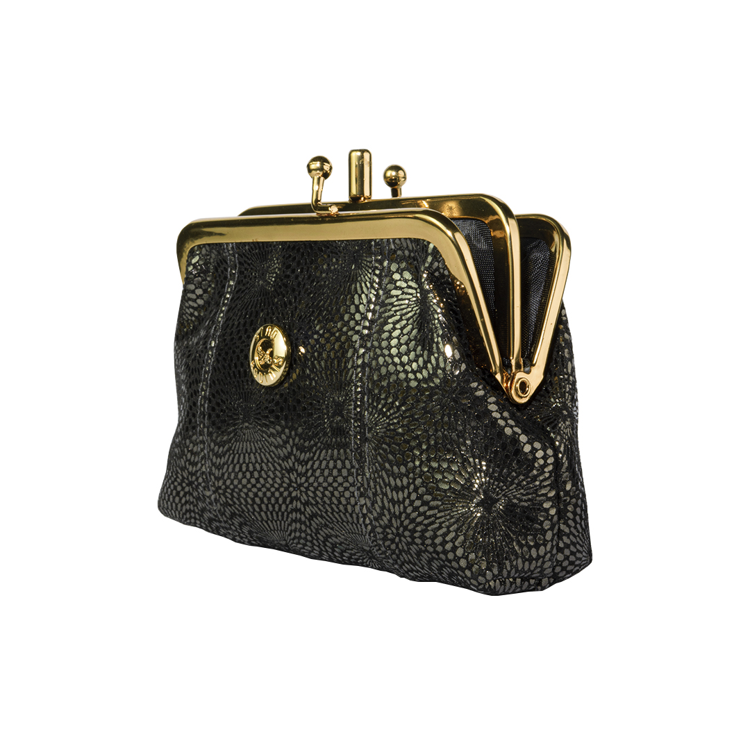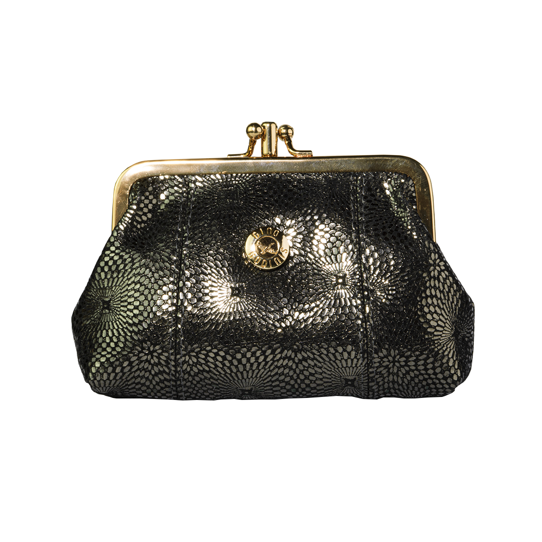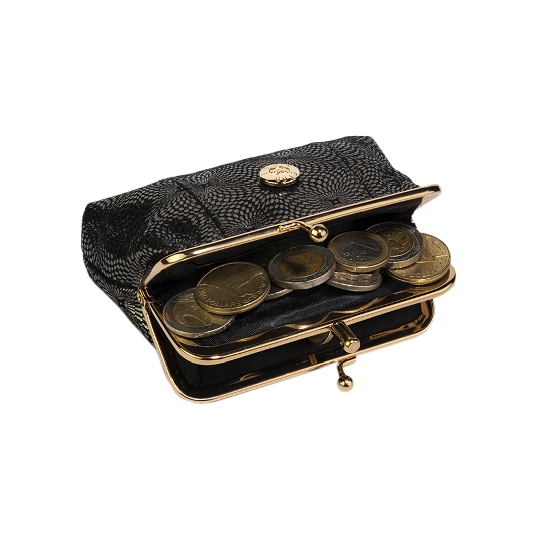 MONEDERO DE CUERO CON MARCO METÁLICO DORADO Y DOS DIVISIONES INTERIORES.