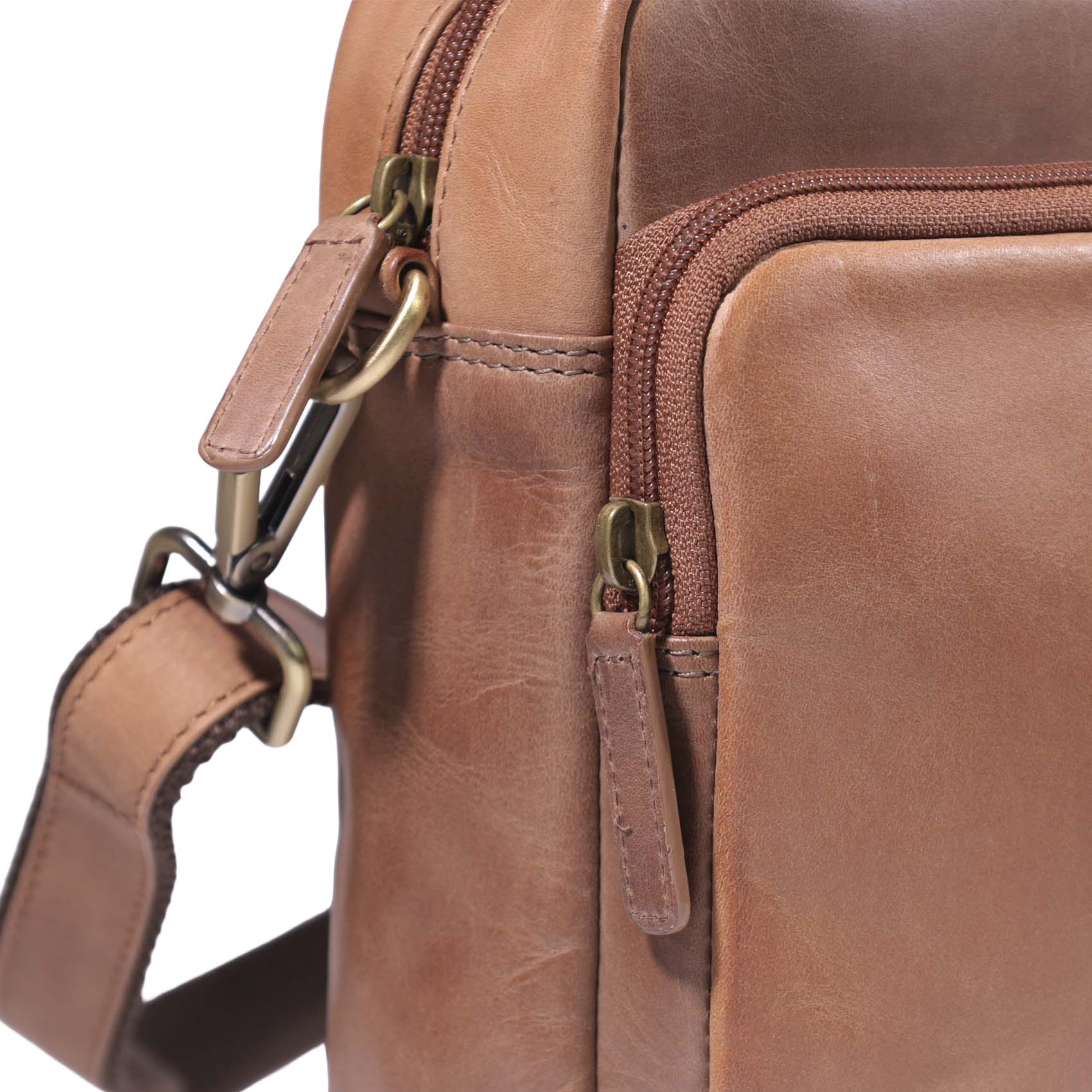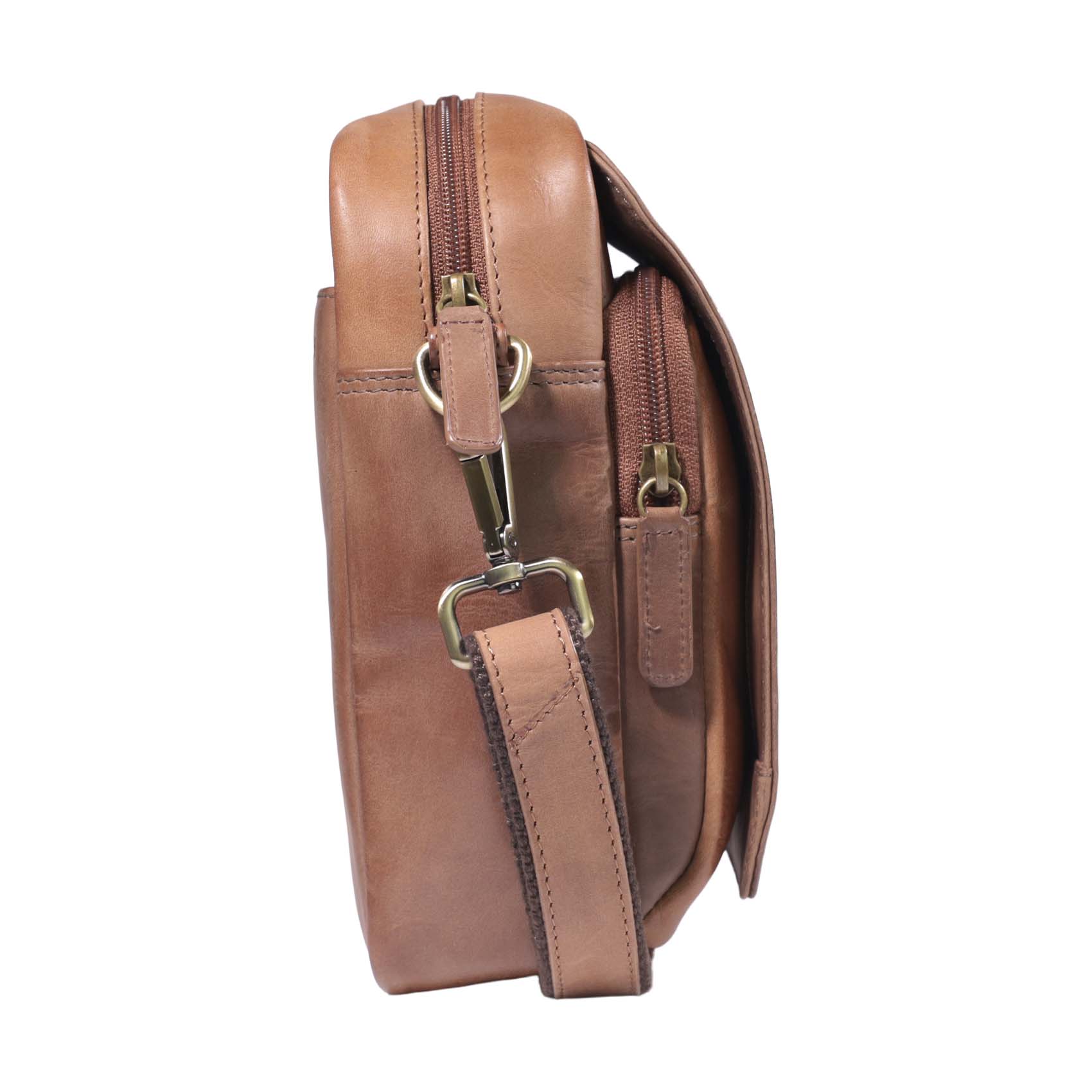 Morral de cuero genuino con broche imantado y bolsillos funcionales. Diseño práctico, elegante y resistente.