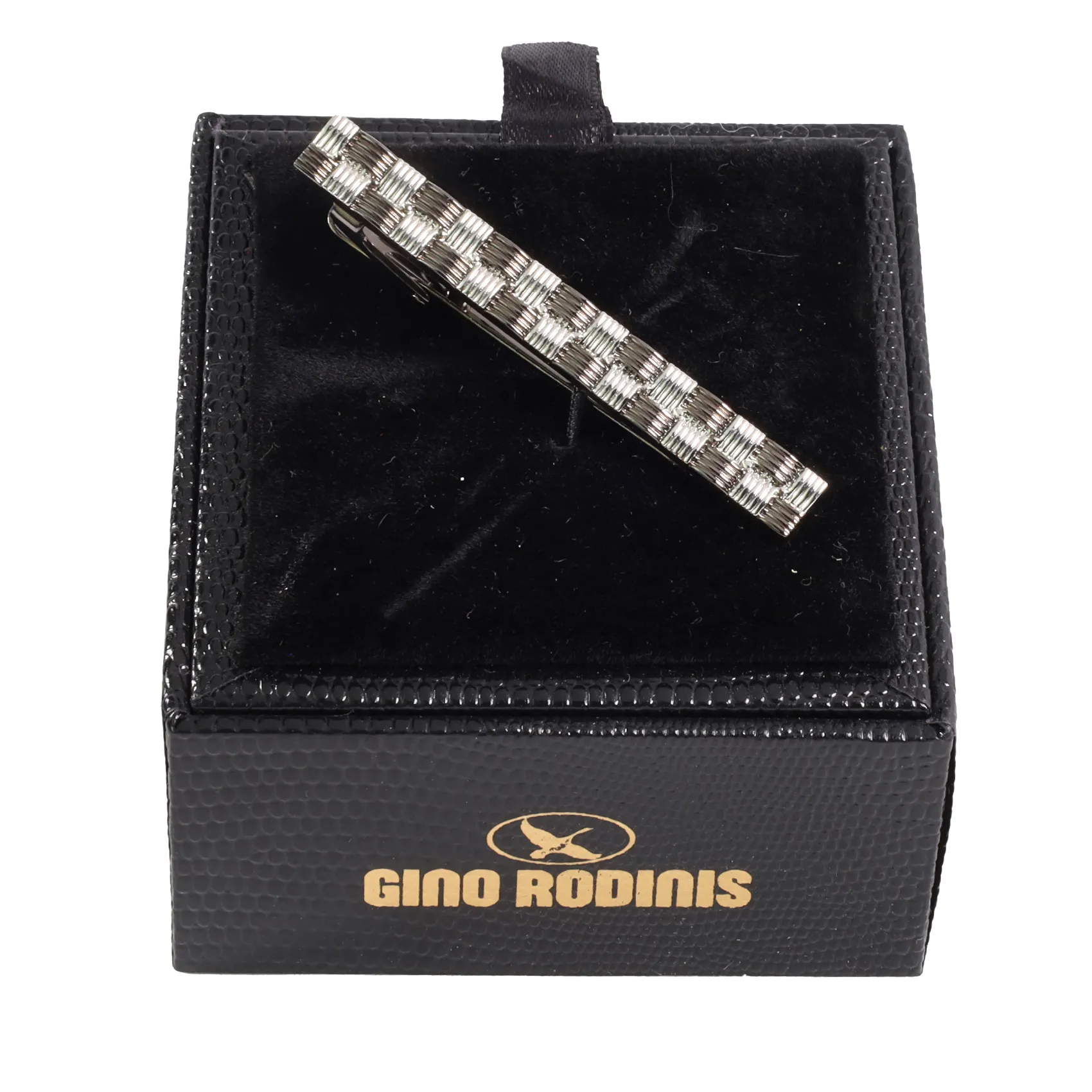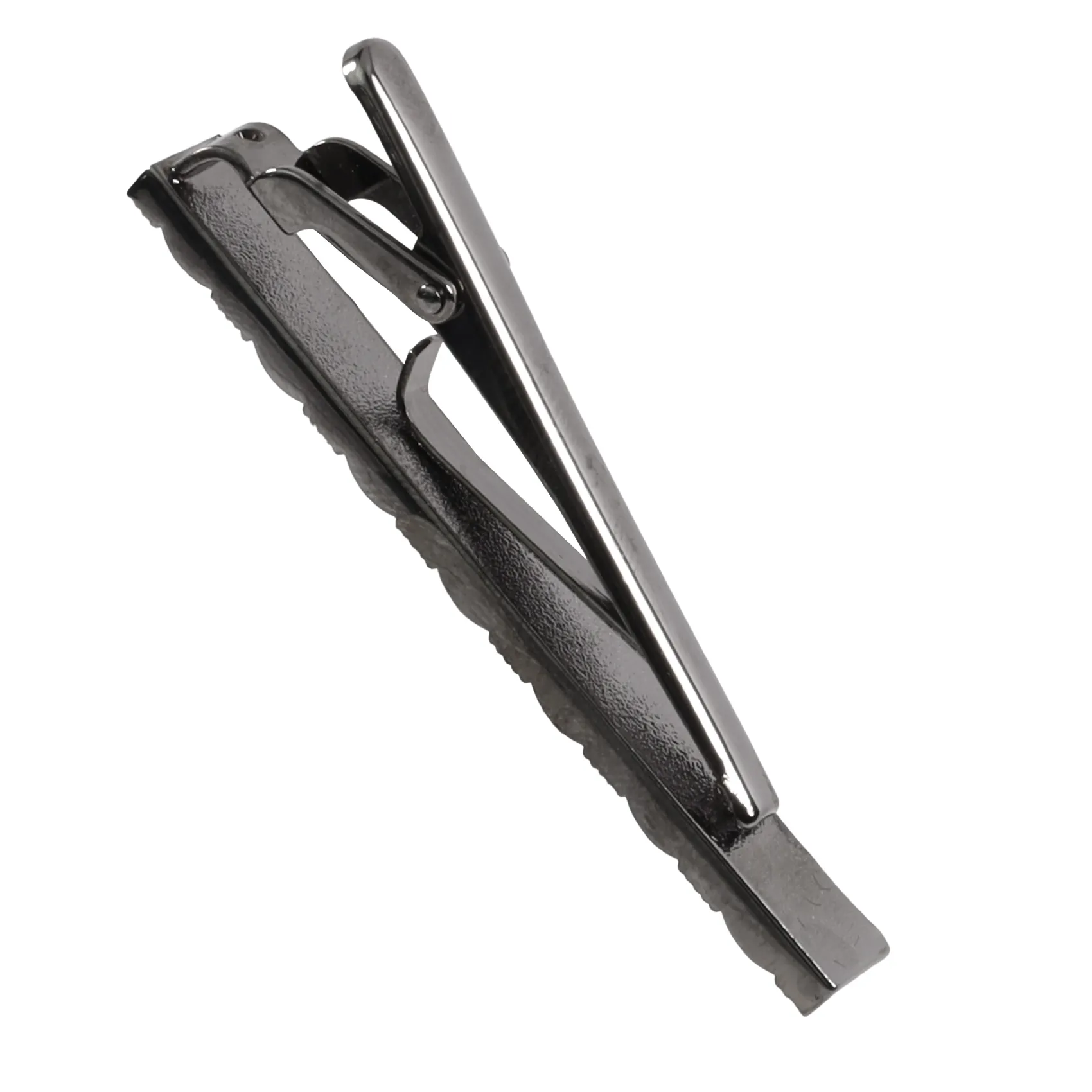 PASADOR DE CORBATA DE METAL, DISEÑO DE BARRA RANURADA EN COLORES NEGRO Y PLATA BRILLANTE