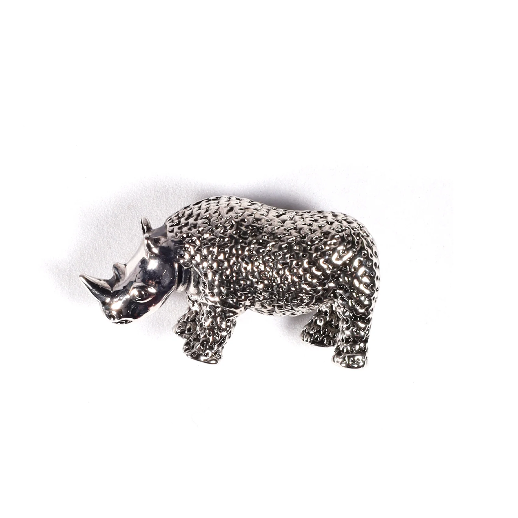 PIN METÁLICO, TRIDIMENSIONAL DE RINOCERONTE COLOR PLATA CON PUNTOS.