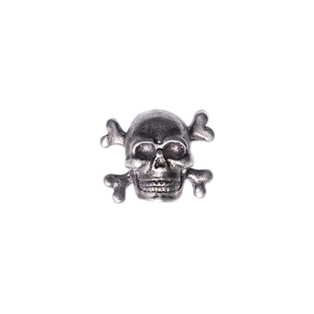 PIN METÁLICO, TRIDIMENSIONAL DE CALAVERA CON HUESOS EN COLOR PLATA ENNEGRECIDA.