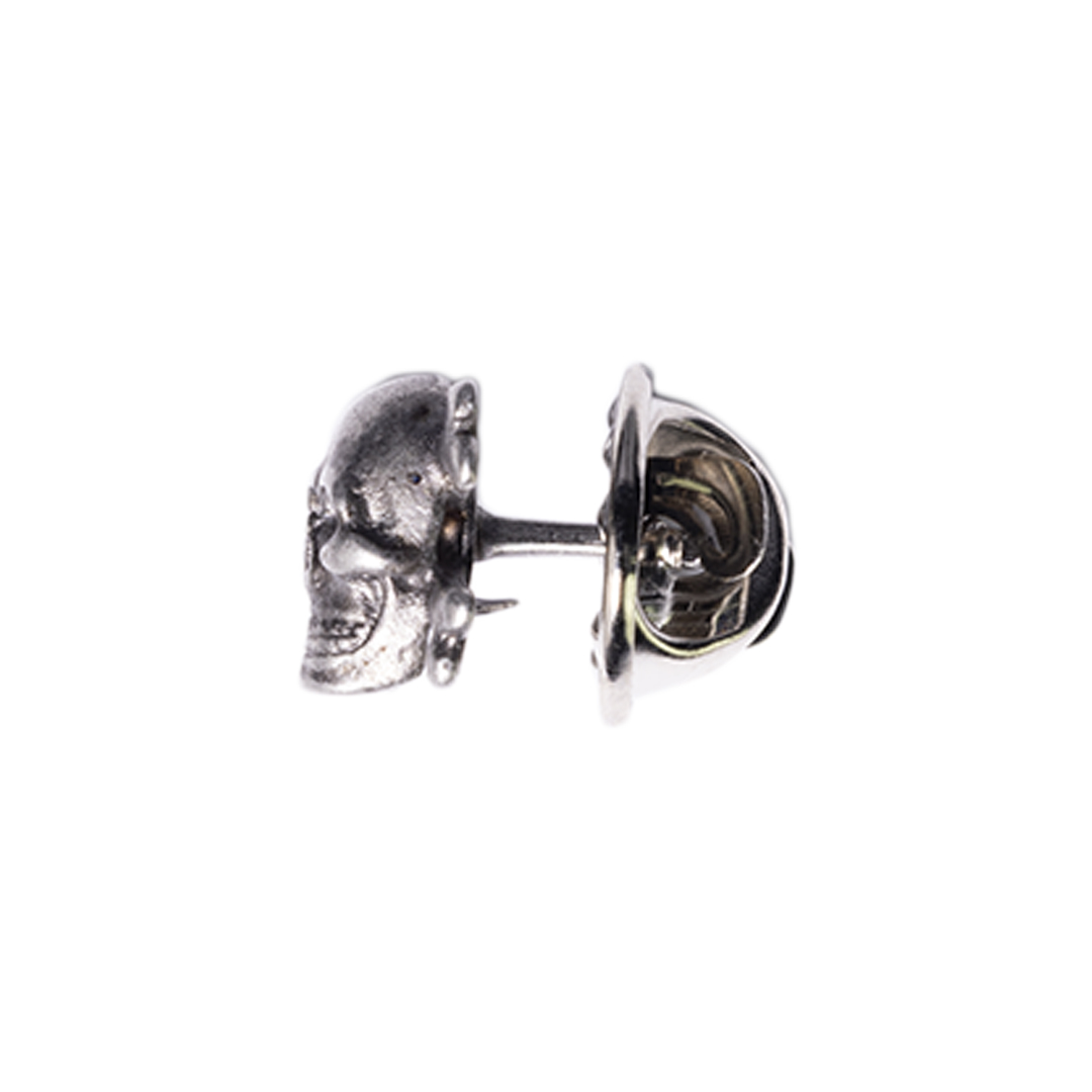 - Pequeño pin metálico, con una calavera entre dos huesos en tres dimensiones.