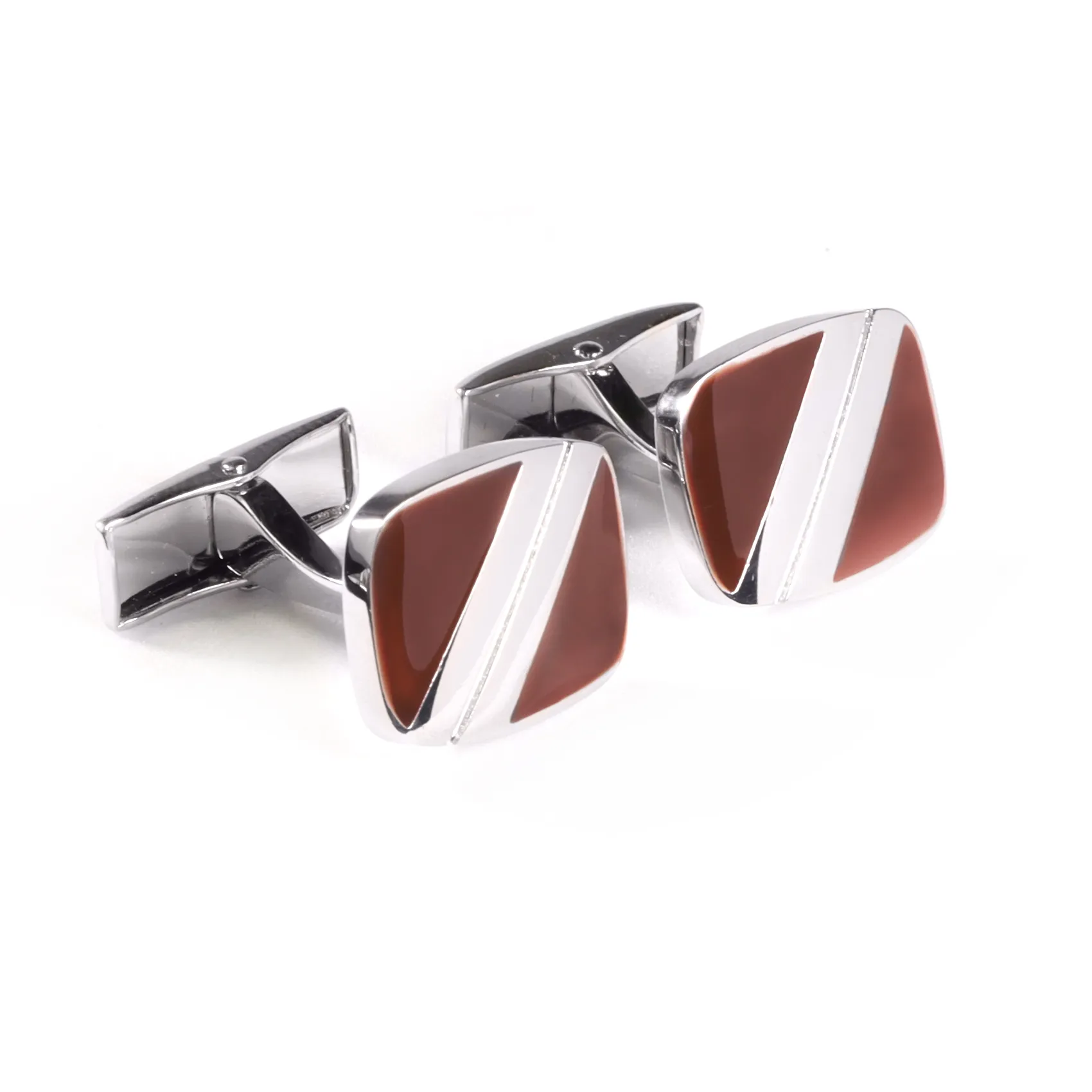 - Diseño del conjunto: Bases metálicas plateadas, con centros esmaltados en tono marrón.