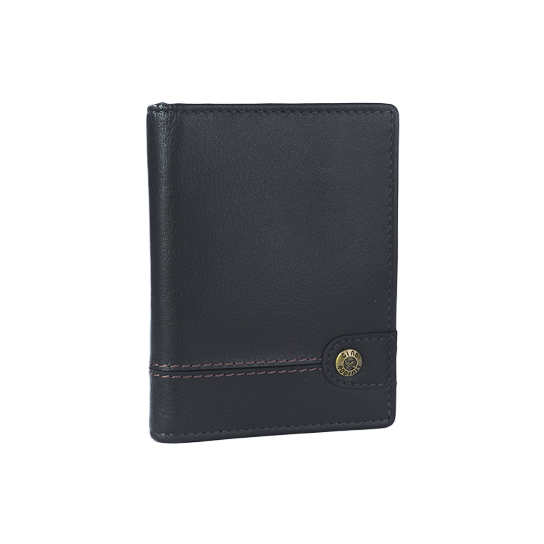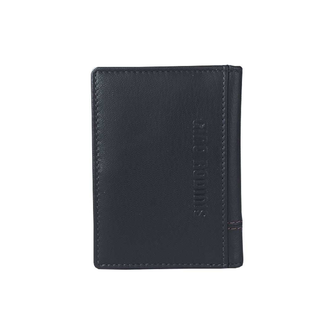 TARJETERO DE CUERO VERTICAL CON TECNOLOGÍA RFID, BROCHE DE PRESIÓN Y LOGO METÁLICO, SEIS (6) COMPARTIMIENTOS PARA TARJETAS.